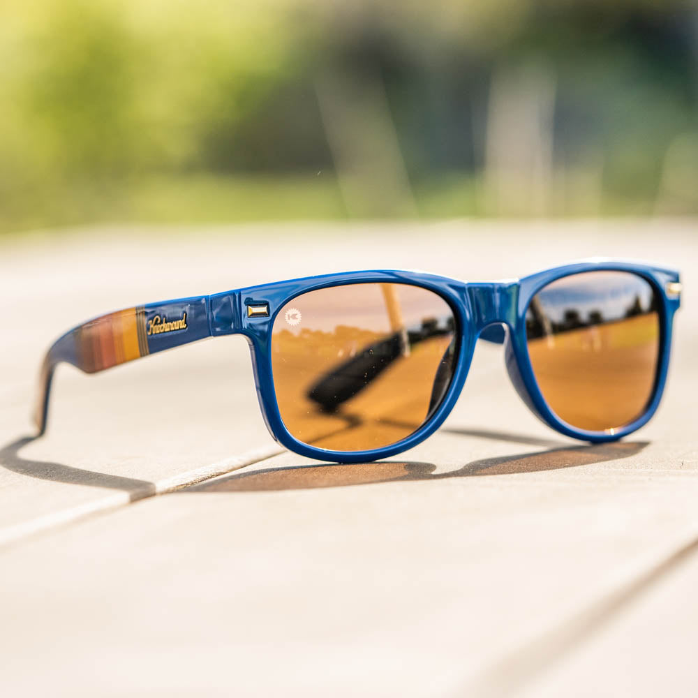 Our Dockside Fort Knocks polarized sunglasses are a perfect throwback to relaxed retro style. Warm striping on the arms with navy front frames matches the flashy gold accents perfectly, while amber polarized lenses keep your admirers guessing. UV400 protection and impact resistance offer peace of mind whether you’re practicing your swing or heading out to lunch, and our handy pouch is on standby when you’re ready to call it a day. We’d remind you to take it easy, but we think the polarized sunglasses speak for themselves.