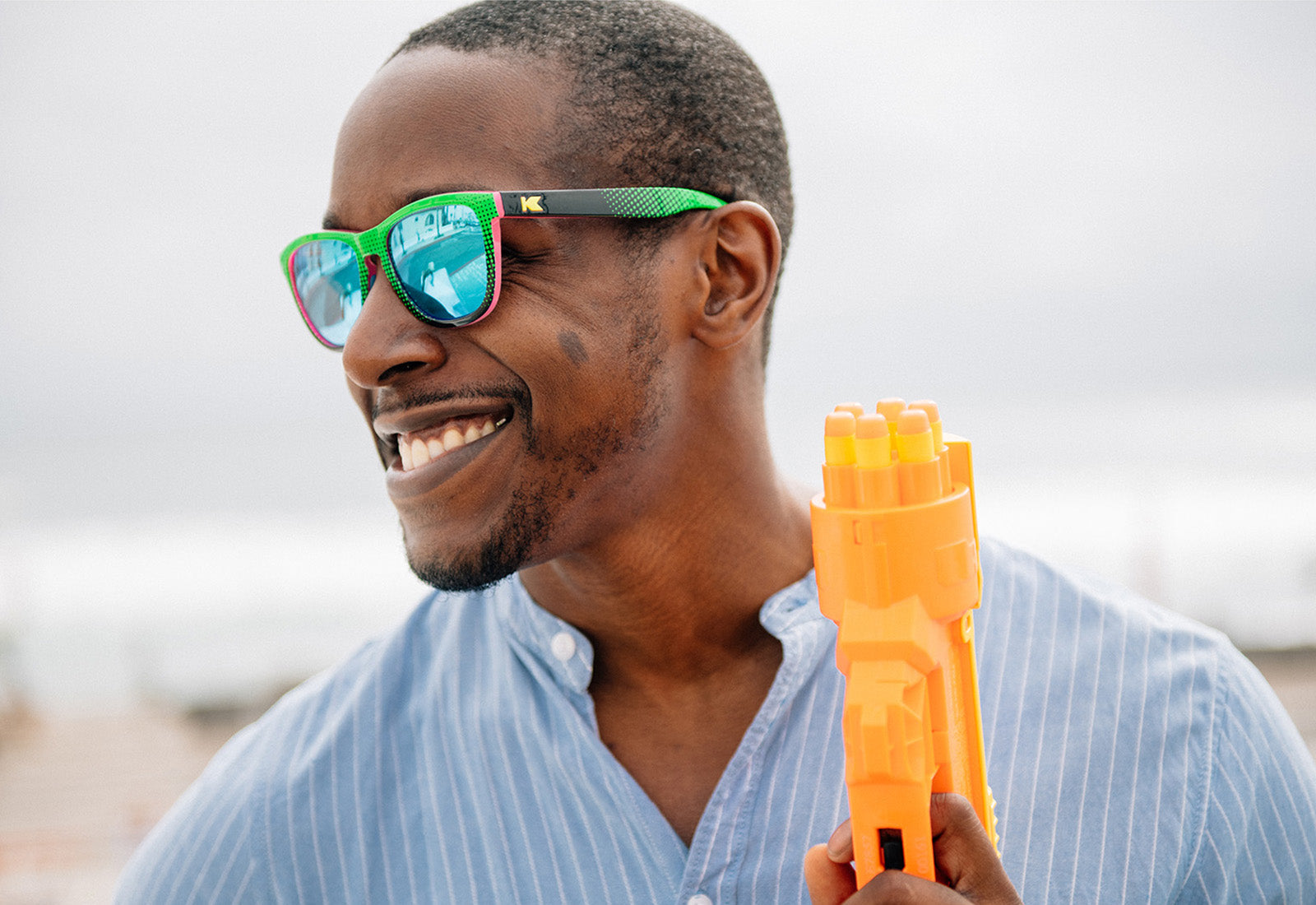 The Nerf Premiums Sport sunglasses call back all of the best elements from the 90’s era Nerf for a frame full of fun. The front features a hail of dots, like a sky full of darts, fading from lime green to black. This fade is mirrored on the exterior of the arms, while the interior of the arms features a similar fading dot pattern, this time from neon pink to electric blue. Bright yellow K-logos and pool-blue tinted lenses give these shades an even higher level of pop. Plus, embedded aqua-blue rubber nose pads mean that no matter how much you sweat during your next blaster battle, these won’t slip or bounce one bit.