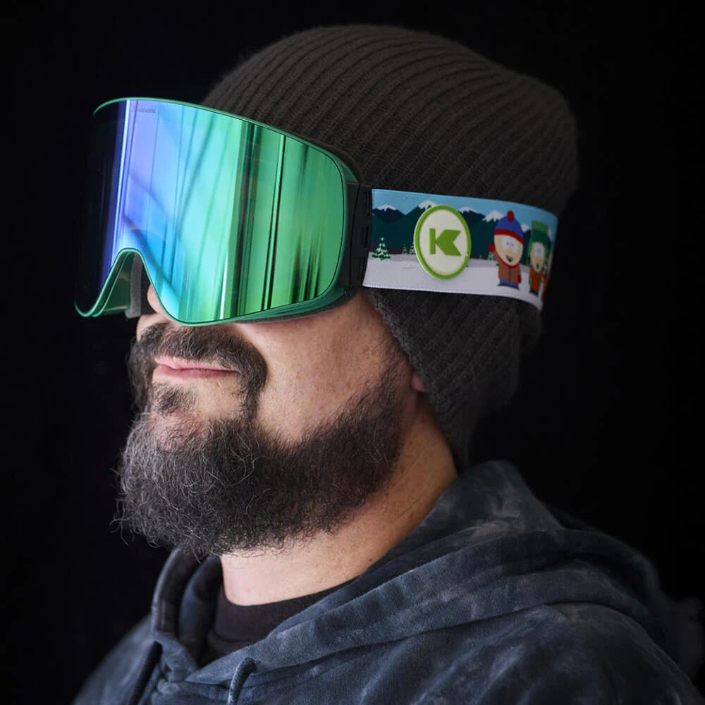 Get ready to conquer the slopes with Knockaround’s South Park Slingshots, where mischievous design meets high-performance function. These goggles feature a cylindrical, green mirrored lens that’s perfect for bright, sunny conditions, delivering crisp visibility with a VLT (Visible Light Transmission) of 18%. The 45mm adjustable elastic strap showcases the familiar faces of Stan, Kyle, Cartman, and Kenny, set against a snowy landscape straight out of the South Park title scene. Whether you’re channeling Cartman’s “respect my authority!” or cruising with style, these goggles ensure you stand out while staying locked in.