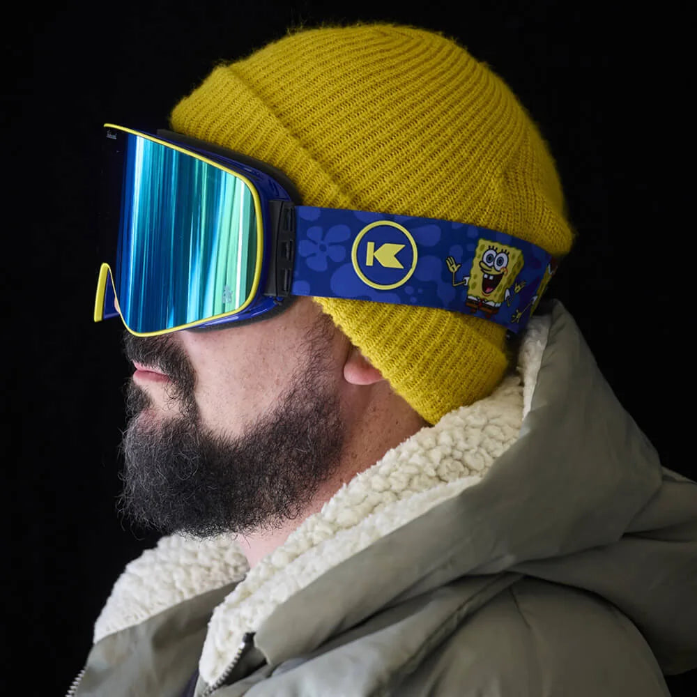 Dive into snowy adventures with the SpongeBob SquarePants Slingshots! These snow goggles combine top-notch performance with the playful energy of Bikini Bottom’s most beloved resident. Featuring a cylindrical, blue mirrored lens that’s ideal for sunny days with a Visible Light Transmission (VLT) of 10.8%, you’ll have clear visibility as you make your way down the slopes. The adjustable 45mm elastic strap showcases SpongeBob’s signature grin against a vibrant blue background, letting you channel his infectious enthusiasm with every run.