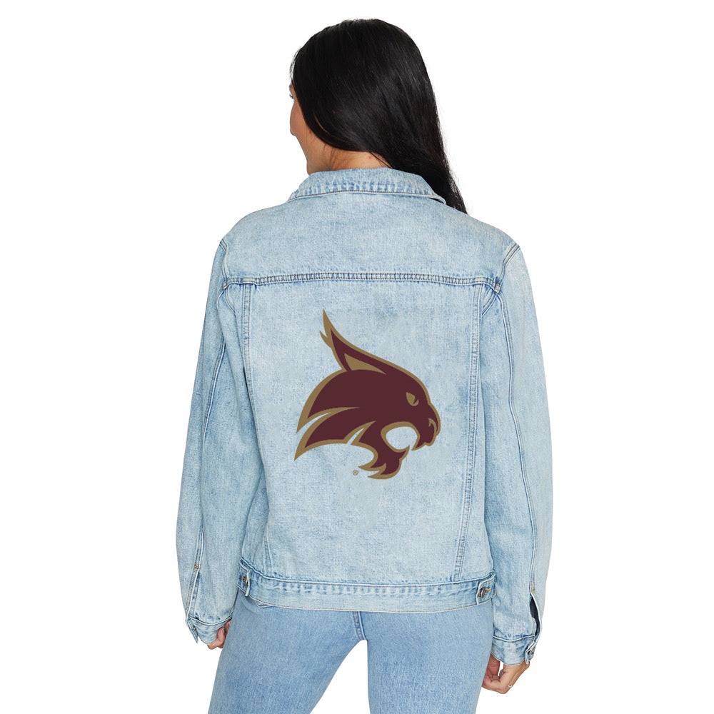 Texas State!! Obsessed with our new Texas State Denim Jacket! Vintage denim jacket complements any outfit! Super cute and comfy! Pair with your favorite pair of black jeans or leggings or over our Texas State Crop Top. Perfect for a night out or everyday.
