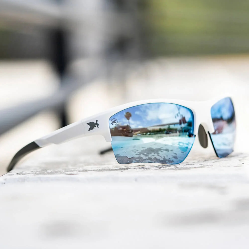Our Clean Sweep Flight Paths sunglasses come in clutch when you’re out on the sunny course. Bright white molded frames stay flashy without going overboard, while cool gray nose pads and ear grips keep your shades in place with ease. Jealous parties might get an eyeful, but you’ll stay cool thanks to sky blue lenses with Knockterra™ performance lens tech that resists both water and oil. And remember that every pair comes standard with UV400 protection and impact resistance for those rowdy celebratory moments you just can’t resist.