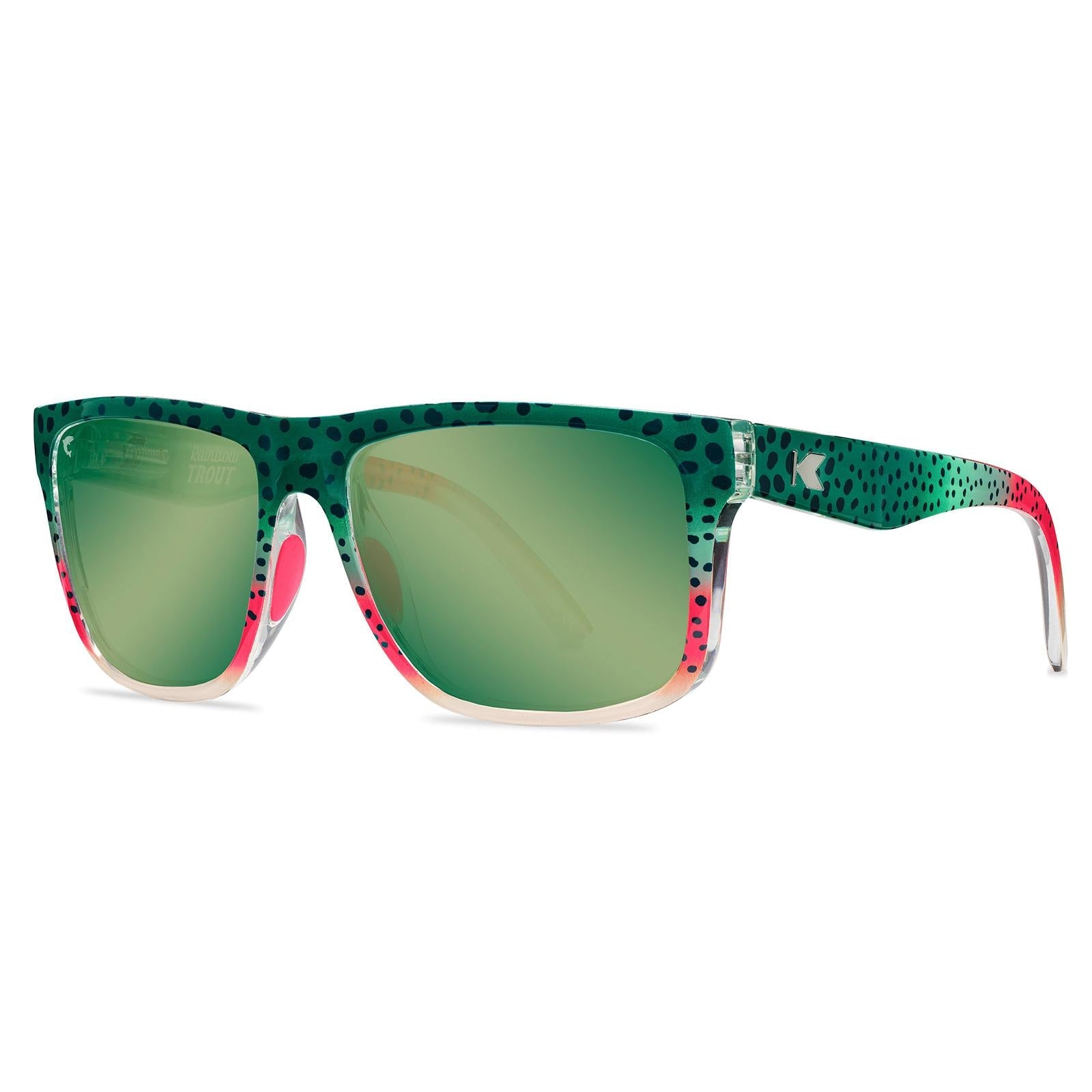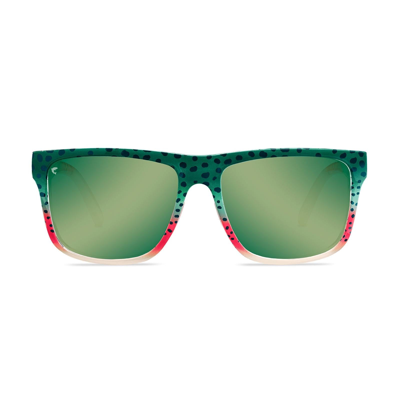 The Rainbow Trout Torrey Pines Sport sunglasses bring the vibrancy of the wild to life. Blue-green at the top of the speckled frame fades gently to crimson before ending in translucent beige along the arms. Top it off with a light blue interior for a look that comes straight from the streams of Montana. Polarized olive green lenses etched with a rainbow trout silhouette provide optimal glare reduction, making them as functional as they are eye-catching. Finished with silver K logos and pink embedded rubber nose pads, these shades combine rugged style with superior comfort. With FDA compliant, impact-resistant lenses and full UV400 protection, they’re ready for any adventure and come with a babbling river microfiber pouch for safe keeping.