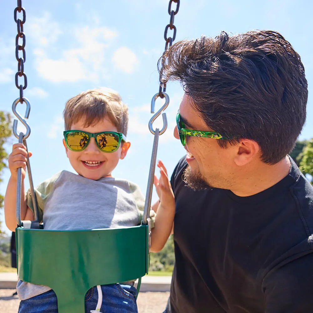 Inspired by the fearless antics of the Teenage Mutant Ninja Turtles and designed on our Premiums frame style, these sunglasses are as bold and exciting as a slice of pepperoni pizza after a sewer skate session. With vibrant semi-transparent green frames that scream "Cowabunga!" and arms that flaunt classic comic strip scenes, these shades aren't just sunglasses—they're a portal to adventure. Polarized green lenses block any city-sun glare, while detailed graphics bring Leonardo, Michelangelo, Donatello, and Raphael right to your style-sidekick arsenal. Polarized “radioactive” green K logos and the iconic TMNT logo on the inside of the arm round out this shell-shockingly cool pair of shades.