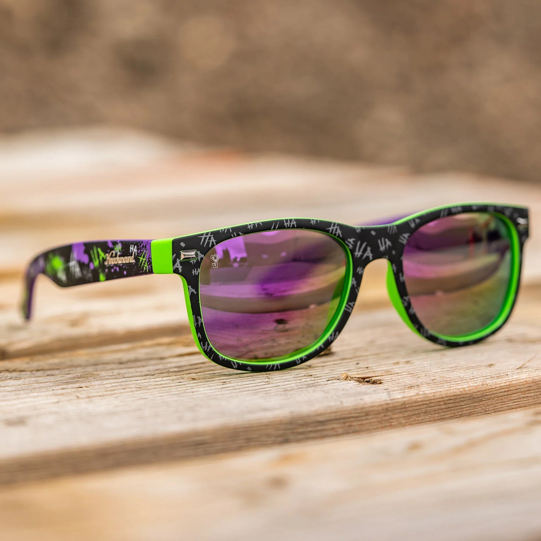 Chaos never looked so cool. The Joker Fort Knocks channel Gotham City’s crown prince of chaos with a punchy green and purple colorway straight from the asylum. Built on our best-selling Fort Knocks frame, these shades feature spring hinges for all-day comfort and a larger fit that’s no joke. Polarized purple-green nebula lenses cut the glare while you stir the pot. Whether you're plotting mayhem or just making your daily rounds, these sunglasses add a wicked twist to your style. Slip ’em on—and remember, it's always fun to watch the world burn (just a little).