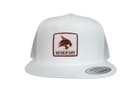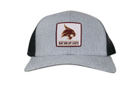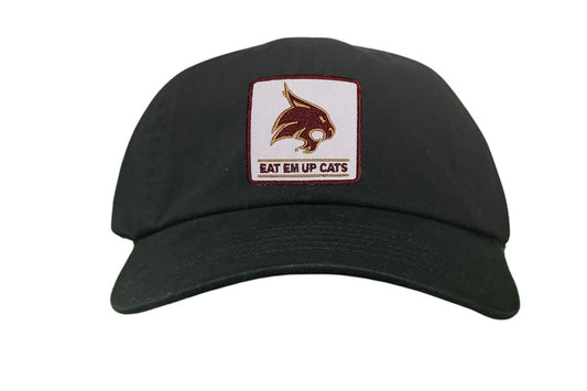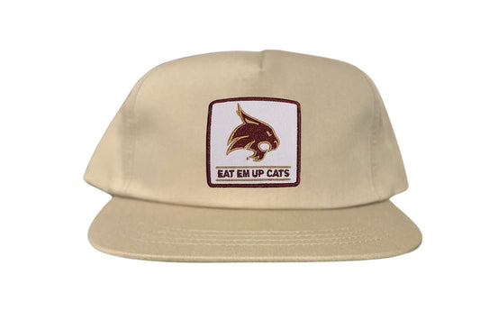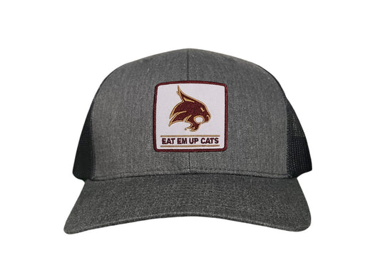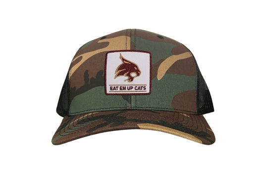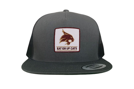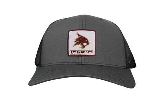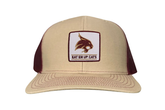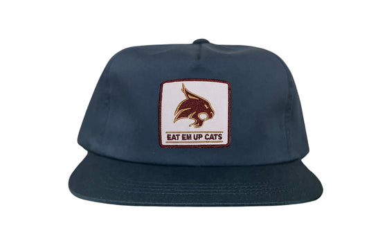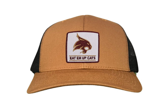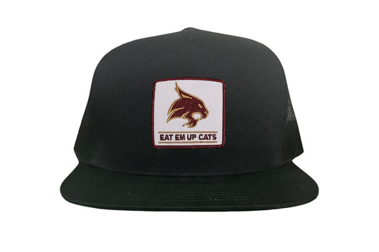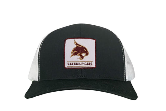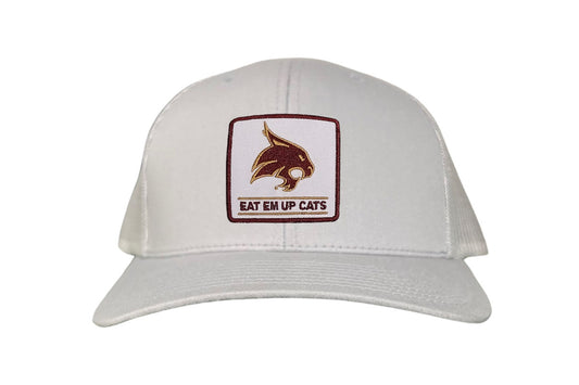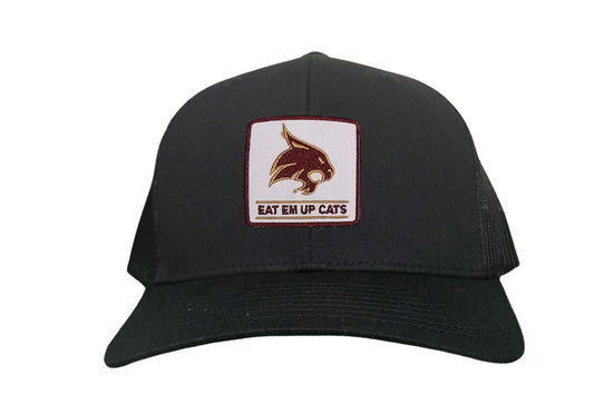 Introducing the Texas State Square Supercat Eat Em Up Cats Curved Bill Trucker hat by Last Stand. This classic Last Stand hat is perfect for Bobcat fans and alumni alike. Show your support for Texas State with this stylish and comfortable Curved Bill Trucker hat featuring an iconic Bobcat on the State of Texas. It's the perfect way to show your school pride.