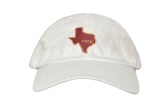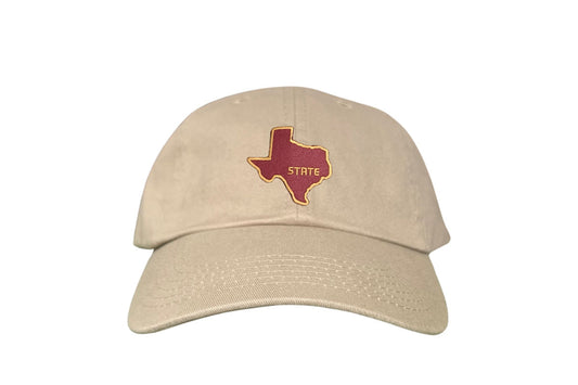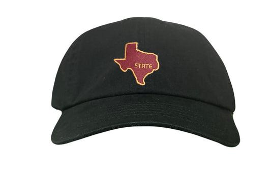 Introducing Last Stand Hats' State of Texas Dad Hat! This stylish and classic hat features a maroon state of Texas outlined in gold perfect for showing off your school pride. This TXST hat also features an adjustable strap for a comfortable fit, making it perfect for any occasion. Represent Texas State University with this classic State of Texas hat from Last Stand and show your support for the Bobcats!
